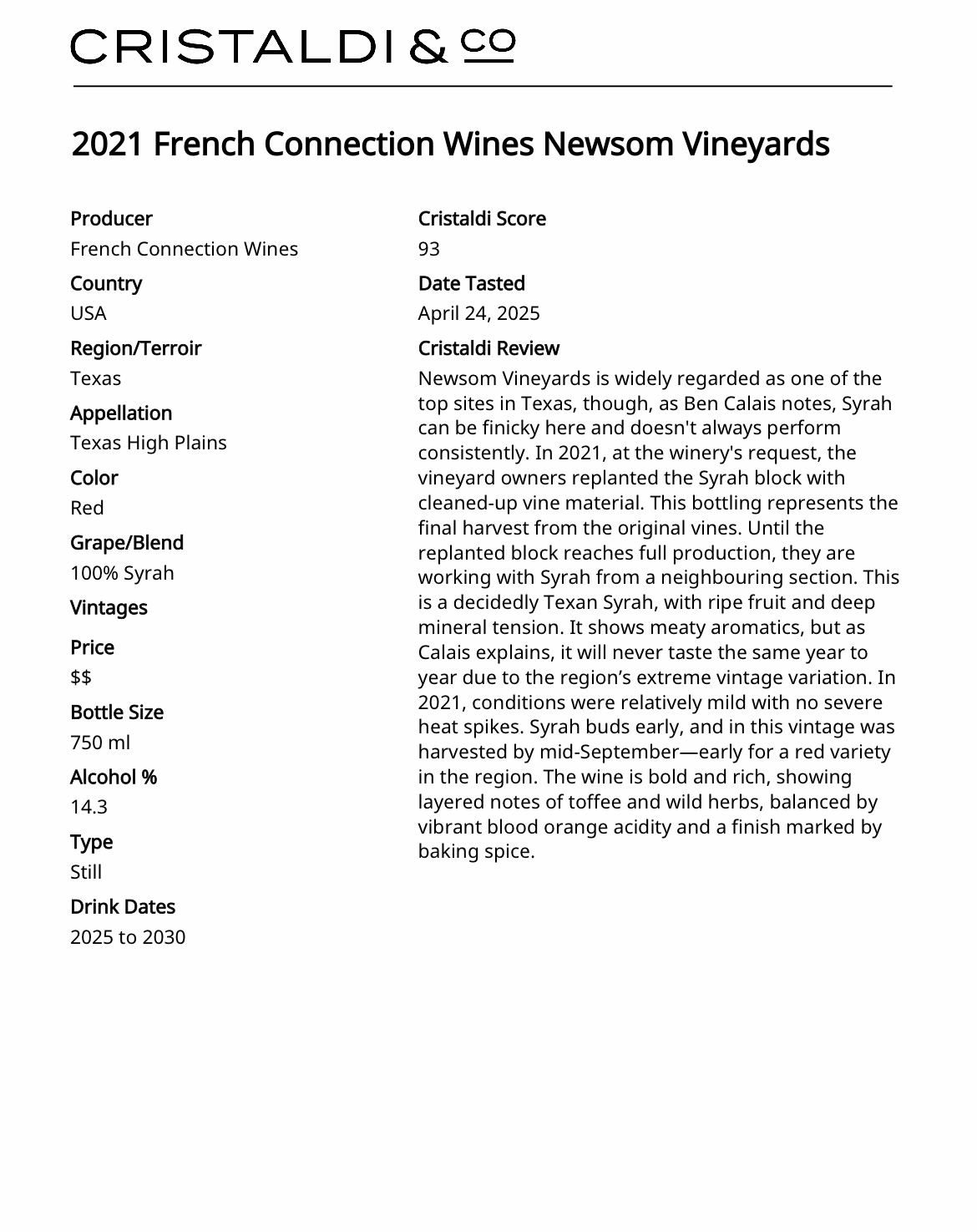 2021 Syrah (Newsom Vineyards) Scores 93 points with Cristaldi & Co